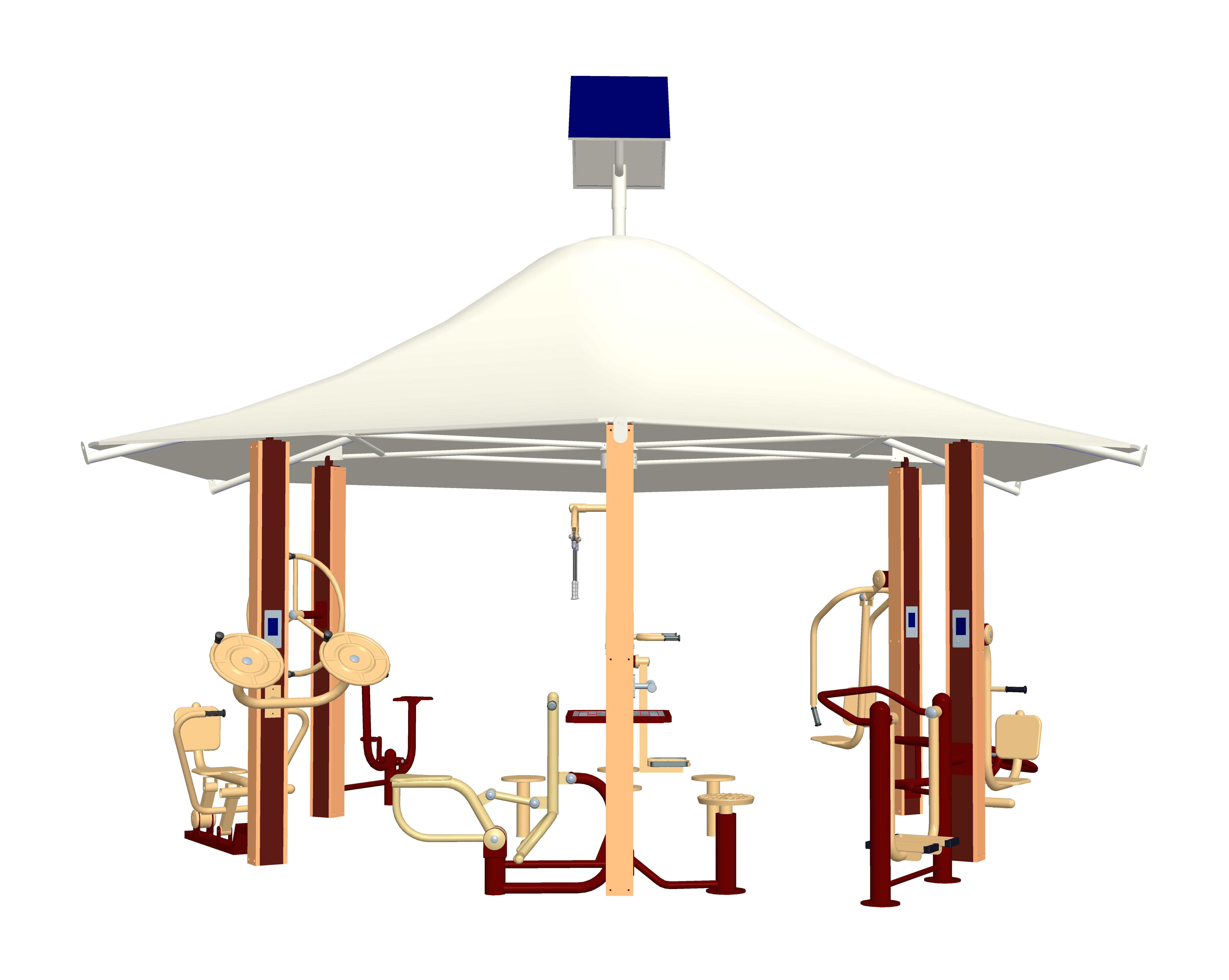 智能(néng)健身驿站是多功能(néng)組合的(de)配置産品,豐富人(rén)們在一個(gè)站點中體驗多功能(néng)鍛煉需求
